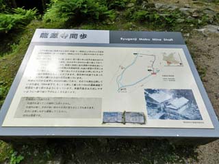 2012/5/12(9:54) 「龍源寺間歩」の案内板。 「龍源寺間歩」は、江戸中期以後に開発された 間歩で、坑道は入口から水平に約630m続いて おり、そのうち入口から156mが公開されて いる。そこから、新たに掘られた観光用の連絡 通路(116m)で「栃畑谷」に抜けるように なっており、坑内は一方通行になっている。 |