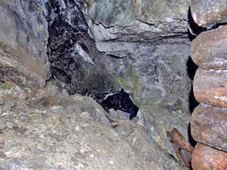 2012/5/12(10:08) 公開用坑道(旧坑道)の終点。 この先も、江戸時代に掘られた、高さ約2m、 幅約90㎝の坑道が続くが、現在は、この先 30~40mの地点で落盤のため塞がっている という。 |
