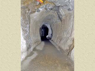 2012/5/12(9:59,10:01) 「横穴(ひ押し坑)」。 鉱脈に沿って掘り進んだ横穴は、「ひ押し坑」と呼ばれ、見学路の中にも、このような横穴が 20ヶ所ほどある。これら横穴には照明が設置され、奥まで見えるように工夫されている。 |