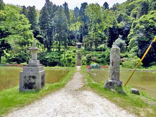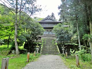 2012/5/12(11:02) 車道(市道銀山線)から見る「妙正寺」。 8時43分に「遊歩道」から撮影したお堂が、 この位置からは小さく写る。 この後、車道を「石見銀山公園」まで歩き、 11時10分、石見銀山を離れる。 |