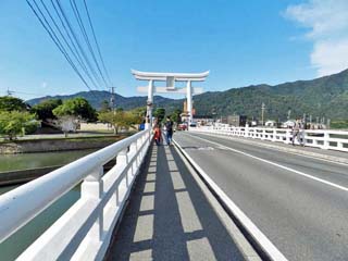 2018/9/26(7:29),2018/9/25(15:09) 道の駅「大社ご縁広場」の駐車場と、「出雲阿国像」。 「大国主大神」を祀り、神在月(神無月)には、全国から八百万の神々が集まるといわれ、 縁結びの神様としても全国に知られる「出雲大社(いずもおおやしろ)」であるが、 ツアーなどの団体行動では、一の鳥居「宇伽橋の大鳥居」から4つの鳥居をくぐり、 御本殿までの片道約1.1kmを歩くことは、ほとんどないであろう。 本ページでは、道の駅「大社ご縁広場」に車を止め、一の鳥居「宇伽橋の大鳥居」から、 石、木、鉄、銅とそれぞれ素材の異なる4つの鳥居をくぐり、「御本堂」を一周。 往路を道の駅まで歩いて戻った記録を紹介する。 なお、途中の一畑電車「出雲大社駅」と、「出雲大社」の本殿周辺については、 別のウインドを表示し、その詳細を紹介する。 左の写真、中央付近には、一の鳥居「宇伽橋の大鳥居」の上部が写る(写真は、翌朝撮影)。 右の写真、「出雲阿国(いずものおくに)」は、歌舞伎の素といわれる女性芸人で、 この「出雲阿国像」は、道の駅「大社ご縁広場」入口の交差点脇に立つ。 出雲大社の近くで生まれた「阿国(おくに)」は、文禄年間、出雲大社の巫女となり、 勧進のために諸国を巡る中、京都四条河原の仮設小屋で演じた「ややこ(子供)踊り」が、 慶長8年(1603)には「かぶき踊り」に変化。するとこれが評判を呼び、全国に広まったのが 現在の「歌舞伎」の始まりという。 右の写真をクリックすると縦に撮る「出雲亜国像」が表示(450x600)されます。 |