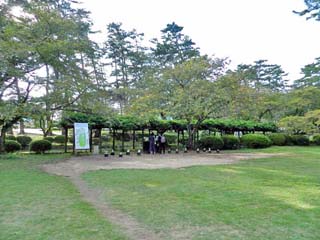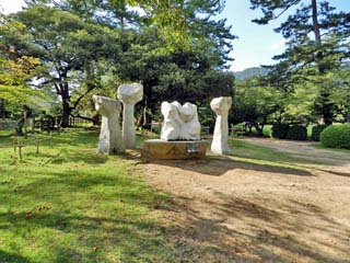2018/9/25(15:33) 「神話の杜」。 「祓橋」を渡ると左(西)側にある。 森のイメージを3本の石で象徴的に表現。 森を舞台に神話に登場する動物達が集い遊ぶ姿を 抽象的に刻んだとある。 写真をクリックすると「神話の杜」を切抜く 画像(600x450)が表示されます。 |