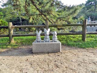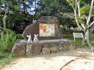 2018/9/25(15:36) 「出雲大社のウサギたち」。 「いなばの白ウサギ神話」では、 「大穴牟遅命(大国主大神)」に助けられた 「ウサギ」は、「大国主大神」と「八上比賣」が 結ばれることを予言し、二神は、この予言通りに 結ばれる。 つまり、「ウサギ」は、「大国主大神」と 「八上比賣」の二神を結ばせた「神」とされる。 この神話にちなみ、「出雲大社」の境内では、 多くの「ウサギ」達を見かける。 写真は、「西神苑」にて撮影。 写真をクリックすると近づいて撮る「出雲大社の ウサギたち」が表示されます。 |
