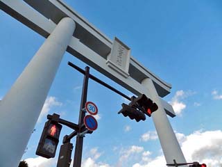 2018/9/25(16:41) 「千家尊福公」の銅像から見る 二の鳥居「勢溜の大鳥居」。 |