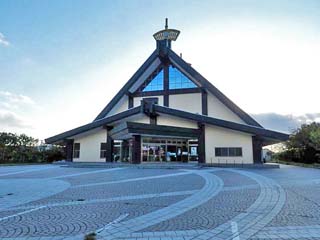 2018/9/25(17:05) 道の駅「大社ご縁広場」に戻る。 写真は、道の駅に併設される博物館「吉兆館」。 館内では、出雲神話や正月行事「吉兆さん」等、 大社町の歴史や文化、伝統行事を紹介するが、 この日は休館中であった。 |