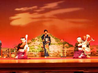 二の演目「唄と踊り」。 2番目の演目は、男性が歌い、2人の女性が踊る。 写真をクリックすると唄と踊りの様子(600x450)が 表示されます。 |