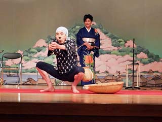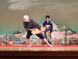 四の演目「銭太鼓」。 4番目の演目は、「銭」を入れた竹筒を両手に持ち、 振ったり回したりして音を出す「銭太鼓」。 写真をクリックすると「銭太鼓」を演じる 様子(600x450)が表示されます。 |