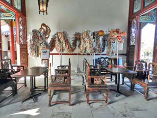 2018/9/28(8:58,8:59) 「華夏堂」の中の展示品。 左の写真、奥に「龍踊り」。右の写真は「九龍壁」。 「九龍壁」は、「富と権力の象徴として、中国の宮廷の出入口につくられた」とある。 また、大理石に彫刻するのが普通だが、写真の「九龍壁」は、中国でも高価な木 「紅木」に彫られている。 左の写真をクリックすると拡大写真(600x450)が表示されます。 |