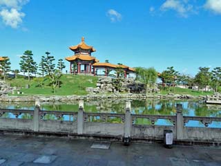2018/9/28(9:03) 「華夏堂」から出たところで見る中国庭園。 「燕趙園」 は、皇家園林方式の中国庭園で、総面積10,000㎡。 順路は、「華夏堂」を出たところを右に進み、池(天湖)の周りを反時計回りに歩いて1周約20分。 車椅子用のルートも設けられている。 注:歩行時間は、「イベントホール」での中国雑技ショーや「展示ホール」での中国書画の鑑賞時間等を除く。 |