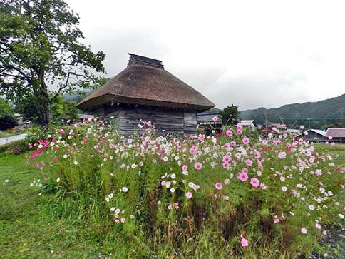 「御机の茅葺小屋」の前に咲く「コスモス」。 農機具小屋として使われ、今ではその役目を終えた「茅葺小屋」だが、
