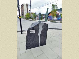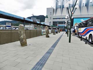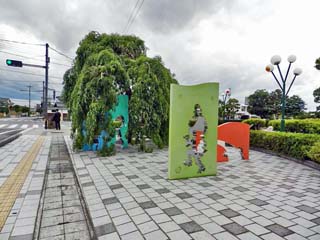 2018/9/26(13:13) 「JR境港駅前」。 歩道の線路(左)側には、銅板に妖怪の世界を 描き出した5基の「妖怪レリーフ」が立つ。 |