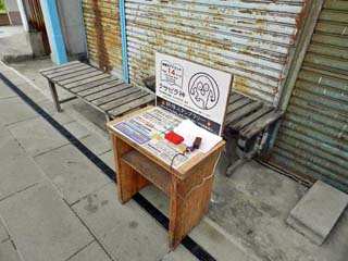 2018/9/26(13:42) 「妖怪スタンプラリー」のスタンプ台。 写真は、「クサビラ神」のスタンプ台。 スタンプ台は、基本的にスタンプに描かれる 妖怪像が立つ場所に近い店の前に置かれるが、 その日が休みの店などは、「みなとさかい交流館」 の中に置かれていた。 |