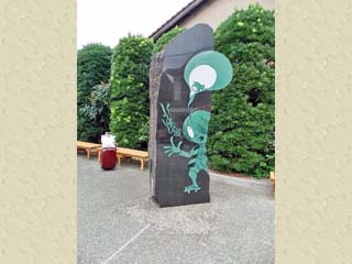 2018/9/26(14:20) 「家に棲む妖怪たち」ゾーンに入る。 写真の妖怪像は、「ばけぞうり」。 「家に棲む妖怪たち」ゾーンの南側歩道には、 9体の「妖怪像(オブジェ)」が立つ。 写真をクリックすると「家に棲む妖怪たち (南側歩道)」のページが表示されます。 |