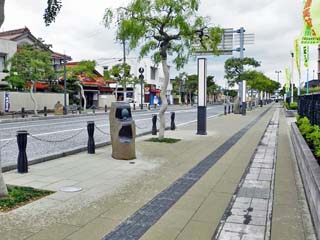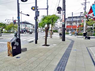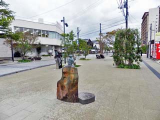 2018/9/26(15:07) 「妖怪広場」横の歩道から駅前方向を撮る。 歩道上には、「妖怪像(オブジェ)」が並ぶ。 |