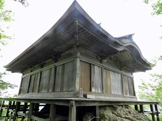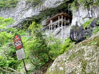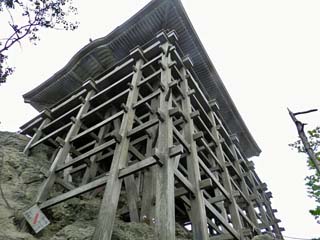 2012/5/10(10:33) 「地蔵堂(国重要文化財)」。 室町時代(16世紀)の建造と考えられるという。 「文殊堂」同様に岩の上に建つ。(特に、この 写真では、岩の上に載る様子がよく分かる) この様な急斜面、崖に張り出すように建物を 建てる技法を「懸造(かけづくり)」という そうである。