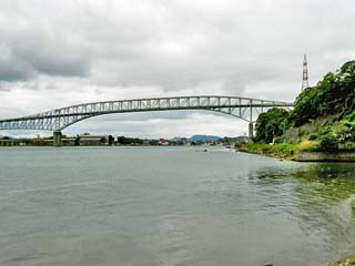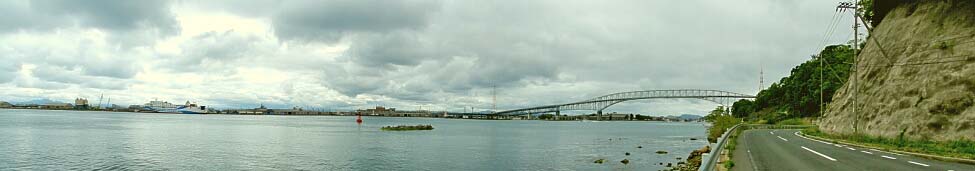 | 2012/5/11(10:56) 島根県側から見る「境水道大橋」。 写真左に写る「境港港」には、境港と韓国の江原道東海市東海港、ロシアのウラジオストクを結ぶ 「DBSクルーズフェリー(イースタンドリーム号)」が停泊している。 中央付近に浮かぶ小さな島は「鯨島」。その左の赤いブイは「境港境水道第六号灯浮標」である。 |