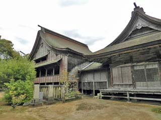 南側から見る「正八幡宮」。 右の建物が「本殿」。 左の「庁屋」は、壁のない吹き抜け構造である。 写真をクリックすると拡大写真(600x450)が