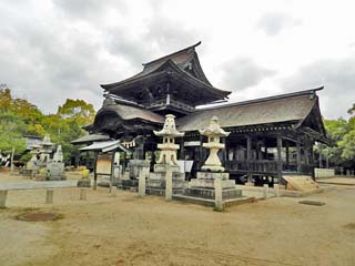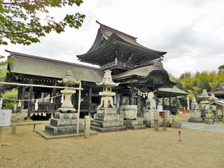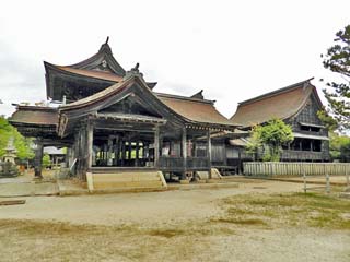 左右から斜めに撮る「楼門」と「庁屋」。 「庁屋」の前に並ぶ「石灯籠」等は左右対称に並んでいる。 |