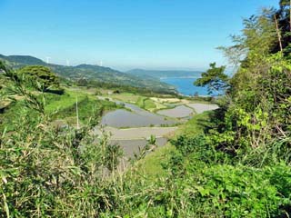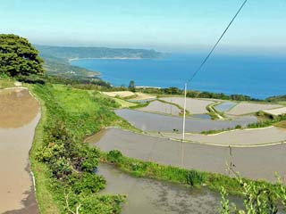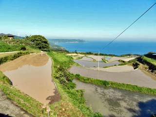 平らな土地の少ない「向津具(むかつく)半島」の土地を有効に利用しようと、海に向かう傾斜地に 造られた棚田である。