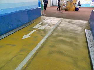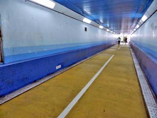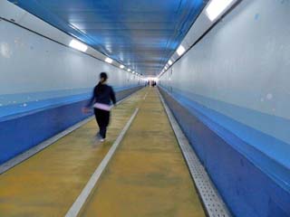 2016/5/16(14:33) 「関門トンネル人道」。 この人道は、「国道2号線」に指定されている。 自転車と50cc未満の原付バイクも利用できるが、 「歩行者専用道路」の扱いであり、乗車しての 通行は認められない(つまり、降りて、押して歩く)。 道の幅は4m。「↑門司」の文字が、道の右側に 書かれているが、これは「右側を歩け」という意味で、 自転車、原付も含め、全てが右側通行である。 |