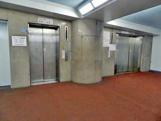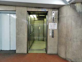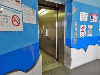 2016/5/16(15:17) 「エレベーター」に乗る。 エレベーターの扉は両側にあり、乗ったときとは、 反対側の扉から降りる。 このため、自転車や原付バイクは、エレベーターの中で 向きを変えることなく、前に押して出ることができる。 |