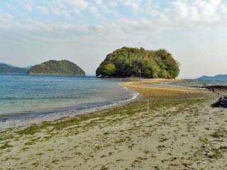 「我島(左)」と「真宮島(右)」。 「砂州の道」が現れていた。 「砂州」を歩いて島に渡り、島を一周することもできたの だが、写真撮影に夢中になり、その間に潮が満ちたら等 と考え、この日は断念。 写真をクリックすると拡大写真(600x450)が 表示されます。 |