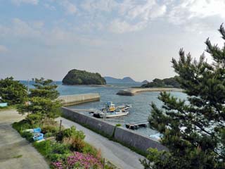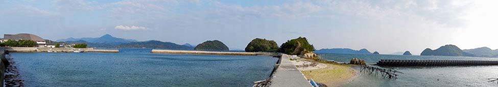 道の駅2階から見る「真宮島(しんぐうじま)」。 「真宮島」は、道の駅「サザンセトとうわ」裏の 「瀬戸内海」に浮ぶ島だが、干潮時には「砂州の道」が 現れ、「周防大島」と陸続きになる島として知られる。