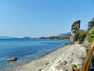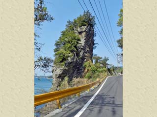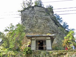 正面から見る「立岩」と「仕合わせ祈願所」。 岩の上には「石斛(セッコク)」が自立し、初夏には 白い花を咲かせるという。 写真をクリックすると縦に撮る「立岩」と 「仕合わせ祈願所」が表示(450x600)されます。 |