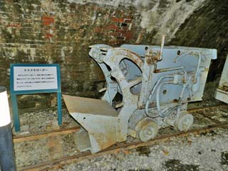 2013/11/24(15:20) 「600Bローダー」。 「鉱石」等を掬い取って、「鉱車」に積んだという。 動力には、「圧縮空気」が使われ、坑内の狭い場所で 効率よく作業ができるように工夫されていた。 |