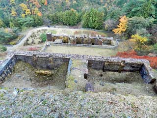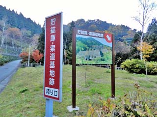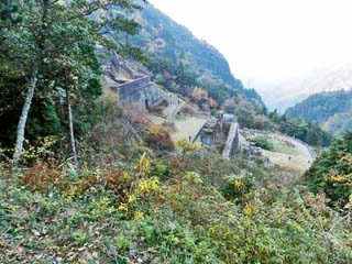2013/11/24(15:57,15:58) 「貯鉱庫」の上部。 案内図の駐車場下にある「子供広場」から撮影。 右の写真、中央の少し上にあるのが「索道基地跡」。 右の写真をクリックすると拡大写真(600x450)が表示されます。 |