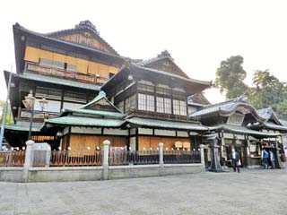 「神の湯本館」。 「神の湯本館」は、「道後温泉本館」の北側に建つ。 (写真左側の建物) 「神の湯(かみのゆ)」は、2階席と階下に分けられ、 階下は、休憩所のない一般の銭湯と同じで、料金も