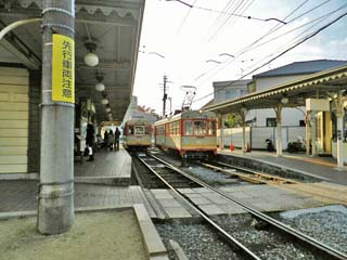 終着駅である。 「坊ちゃん列車」も、他の路面電車と同じホームから 発着し、同じ線路を走る。 |