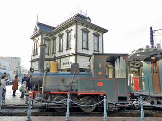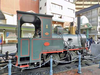 「道後温泉駅」前広場に置かれる「坊ちゃん列車」。 列車の置かれている場所は、観光客の記念撮影用にと駅前広場に造られた引込み線である。