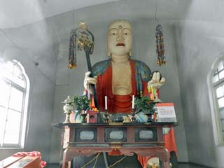 「湯の大地蔵尊」が入る建物。 時間が早かったため、入口には鍵がかかり、7時51分に 撮影している地蔵尊は、扉のガラス越しに撮影。