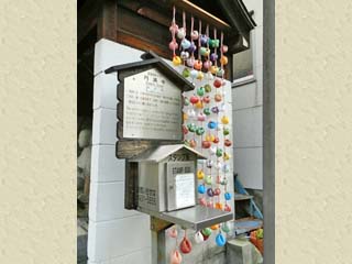 建物の周りは、願掛けの「お結び玉」と「えまたま(俳句 絵馬)」で飾られている。 道後温泉の「湯玉」をモチーフにしたという 「お結び玉」は、左の手のひらにのせ「湯の大地蔵尊」に お願い事をする。「えまたま」は、名前埋め込み型の 絵馬で、相手の名前と自分の名前を書き込むと、 オリジナルの俳句ができあがる。 |