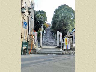 「伊佐爾波神社」石段下。 「伊佐爾波神社(いさにわじんじゃ)」は、「道後温泉駅」の東にある「道後山」の山腹に鎮座し、