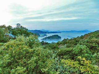 「糸山公園展望台」から見る南方向の景色。 展望図右半分の景色である。 「西瀬戸自動車道」は、四国に入るとすぐに左(南)の