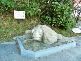 「展望台」登り口にある石造りの「亀」。 「亀」の後ろにある案内板に書かれているのが、 「亀老山の由来」である。 |