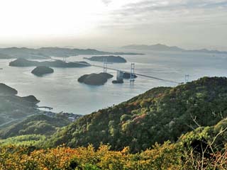 「展望デッキB」から見る南西方向の景色。 右下に「来島海峡大橋」。その左手前に黒く写る山は「館山(標高230.9m)」。 |