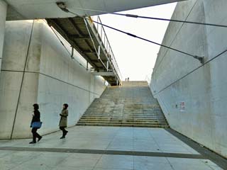 「展望デッキ」への石段。 建築家「隈研吾」が設計する展望台は「パノラマ展望台 ブリッジ」と呼ばれ、周囲の景観にダメージを与えない
