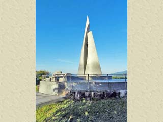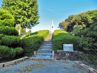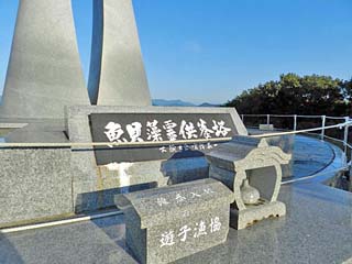 2012/9/27(16:46,16:47) 「魚貝藻霊供養塔」。 養殖業を営む上で犠牲になった多くの魚貝藻に感謝し供養するため、 昭和62年(1987)、「遊子漁協」により建立される。 秋分の日には、2本ある尖塔の間から太陽が昇るように設計されているという。 左の写真をクリックすると拡大写真(450x600)が表示されます。