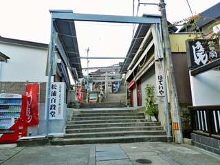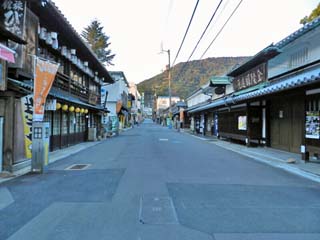 2013/11/27(7:24) 「表参道」に並ぶ「土産物屋」。 この時間は、まだ開店前である。 「石段」も最初の内は平坦な部分が多い。 |