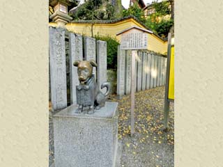 2013/11/27(8:03) 「こんぴら狗の銅像」。 江戸時代、東日本などの遠方から、遠い「こんぴらさん」 まで本人が直接参拝できない時に、「代参」と呼ばれる 旅慣れた代理人に頼んだり、犬が飼い主の「代参」を することもあったという。 この飼い主の名を記した木札や、初穂料、道中の 食費などが入った袋を首にかけた「代参」の犬が 「こんぴら狗」である。 写真をクリックすると「こんぴら狗の銅像」が 拡大表示(450x600)されます。 |