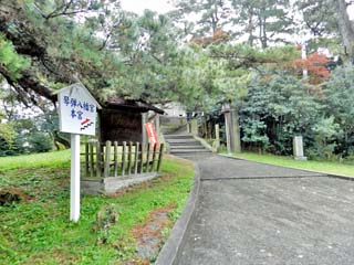 写真左は、参道の入口。右は、参道の上からカメラを下に向けて撮った写真である。 「琴弾(ことひき)八幡宮」は、JR予讃線「観音寺駅」から北西に約1.5kmにある国の名勝「琴弾公園」の 東側にある「琴弾山(標高:58m)」の頂上にある。 江戸時代の読本作家「滝沢馬琴」が書いた「椿説弓張月」の中で、「源為朝」の妻が、 夫を敵方に密告した「武藤太」を誘い出し、仇を討った舞台となっているのが、ここ「琴弾八幡宮」である。