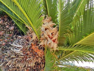 蘇鉄の「株」。 この樹は「雌株」で、根元周り約8m。 土際から5本の太い枝に分かれ、太い枝からは、