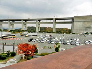 「与島PA」の取り付け道路(ランプウェイ)と第一駐車場。 「与島プラザ」の屋上展望台にて撮影。
