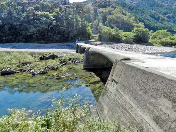 四万十町上岡集落の本村と対岸の向山とを結ぶ橋で、 この辺りは川の流れが急なことから、水の抵抗の少ない曲線を 取り入れた形状とし、その曲線の美しさで人気の橋である。 昭和38年(1963)架橋。橋長60m、幅員3.7m。
