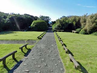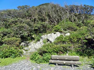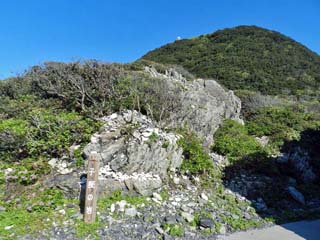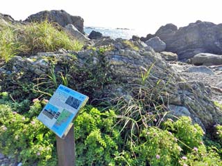 2012/9/25(8:54) 「乱礁遊歩道」。 前方左に「土佐日記御崎の泊」碑。その右に 「エボシ岩」が見えている。 |