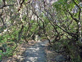 2012/9/25(8:28) 「ウバメガシ」の林。 「ウバメガシ」は、室戸市の「市の木」に指定 され、室戸産馬目樫(ウバメガシ)から作られる 「土佐備長炭」は、火力が強く焦げにくいことで 人気があるという。 |