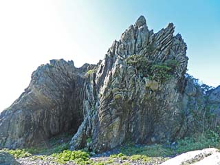 2012/9/25(9:11) 「ビシャゴ岩」。 約1,400万年前に、マグマが地層に入り込み 固まってできた横長の岩が、後の地殻変動で 回転し高く(縦長に)なったという。 写真をクリックすると「ビシャゴ岩」が 拡大表示(450x600)されます。 |